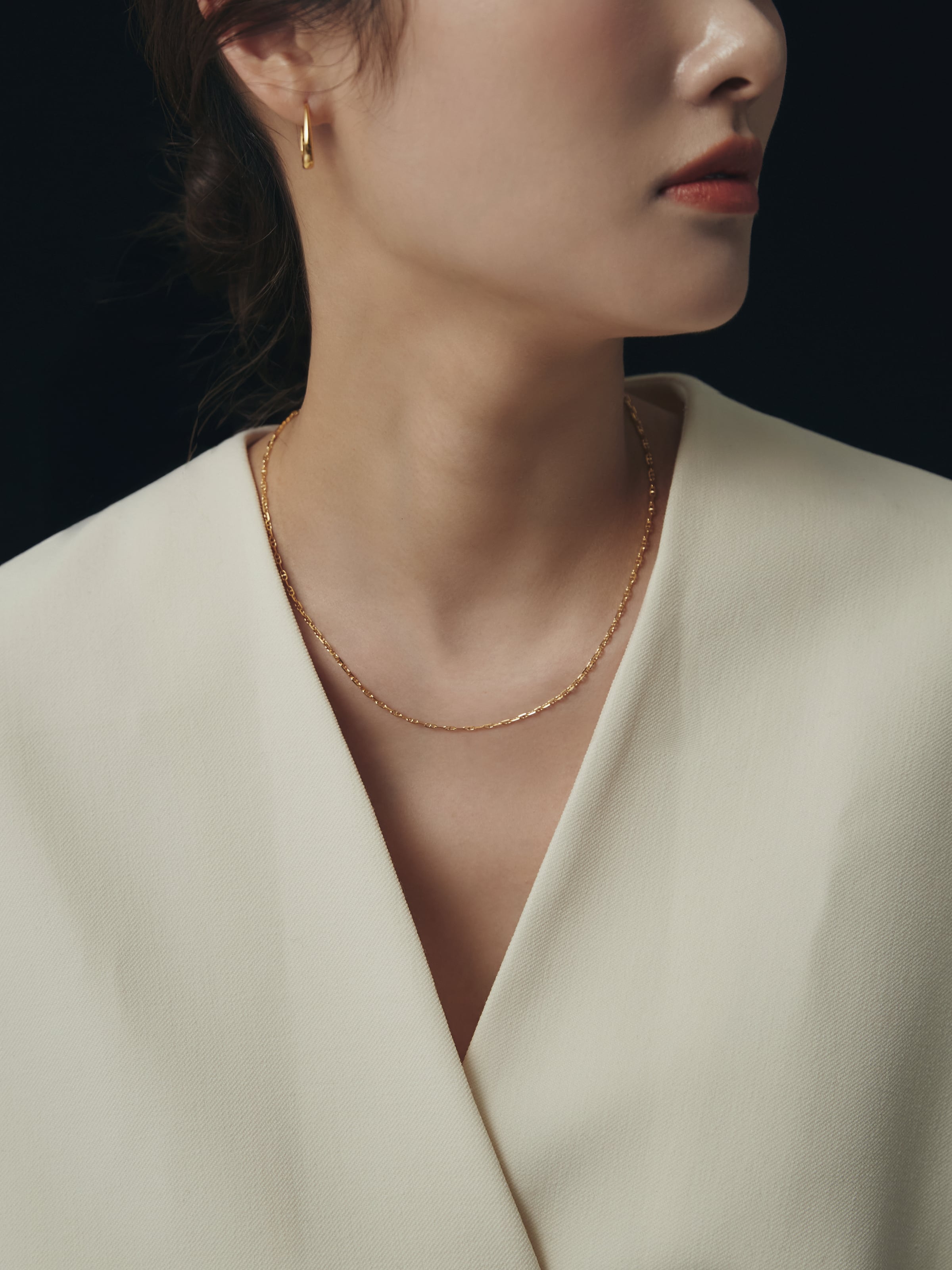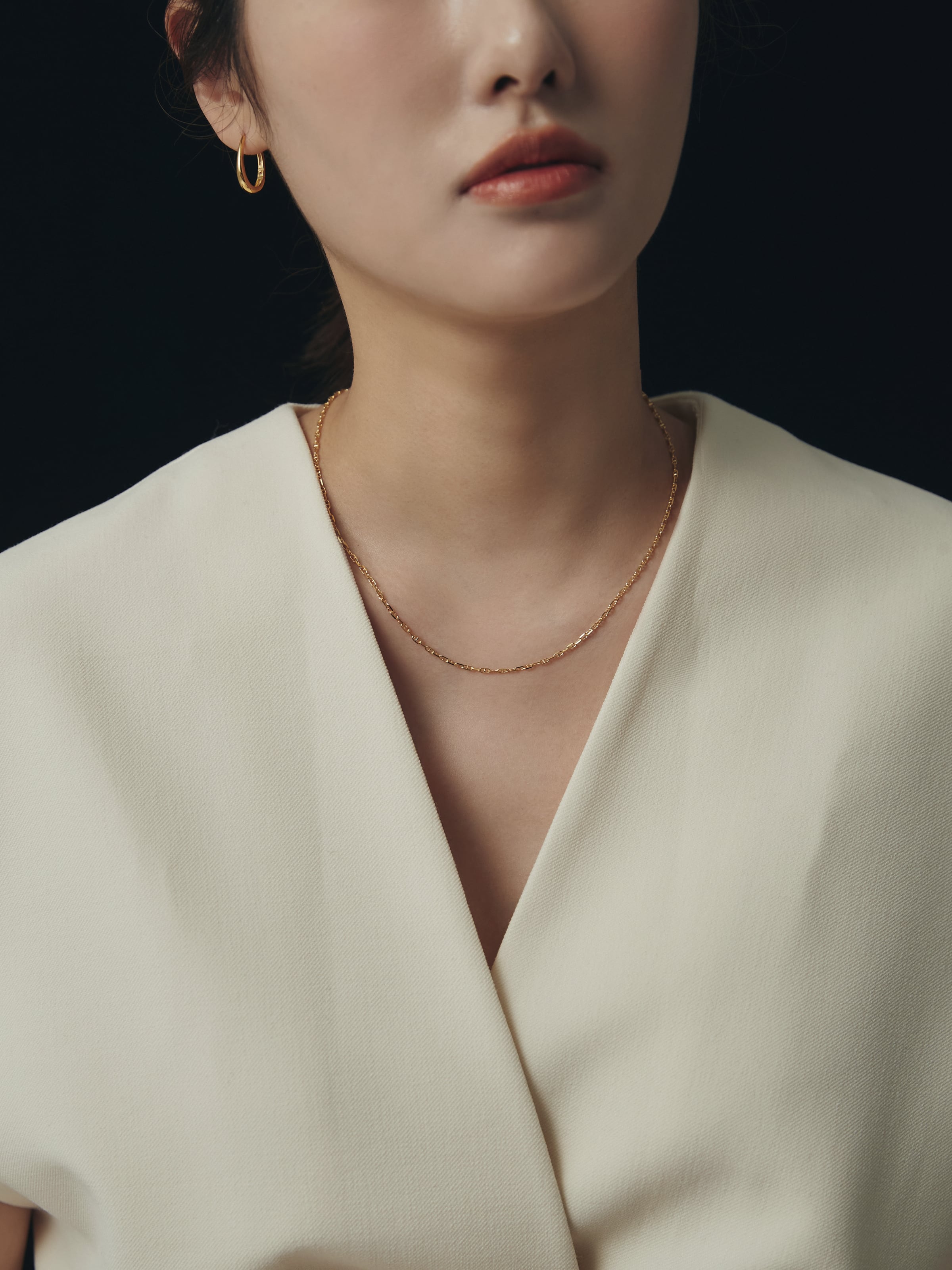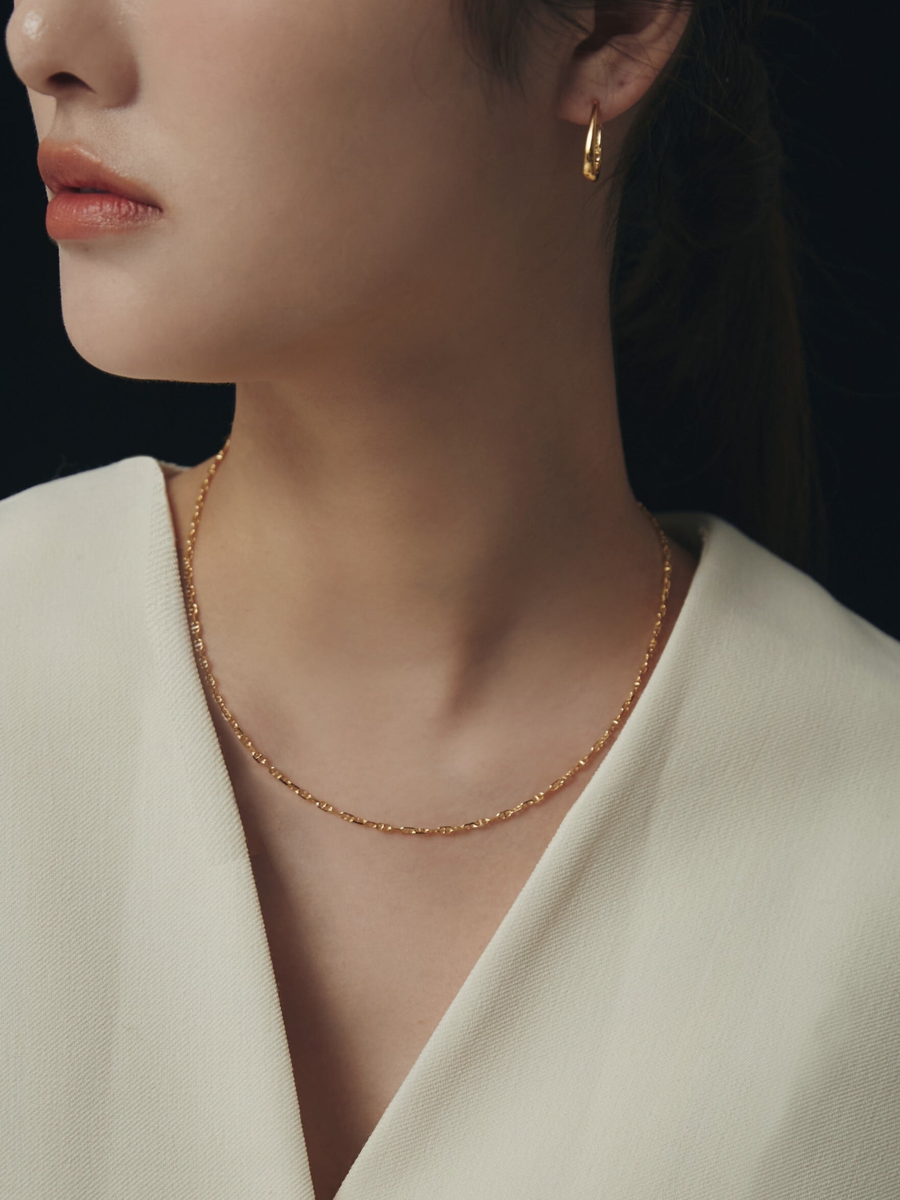 控えめながらも立体感があり、首元に上品な輝きとリズムを加えます。