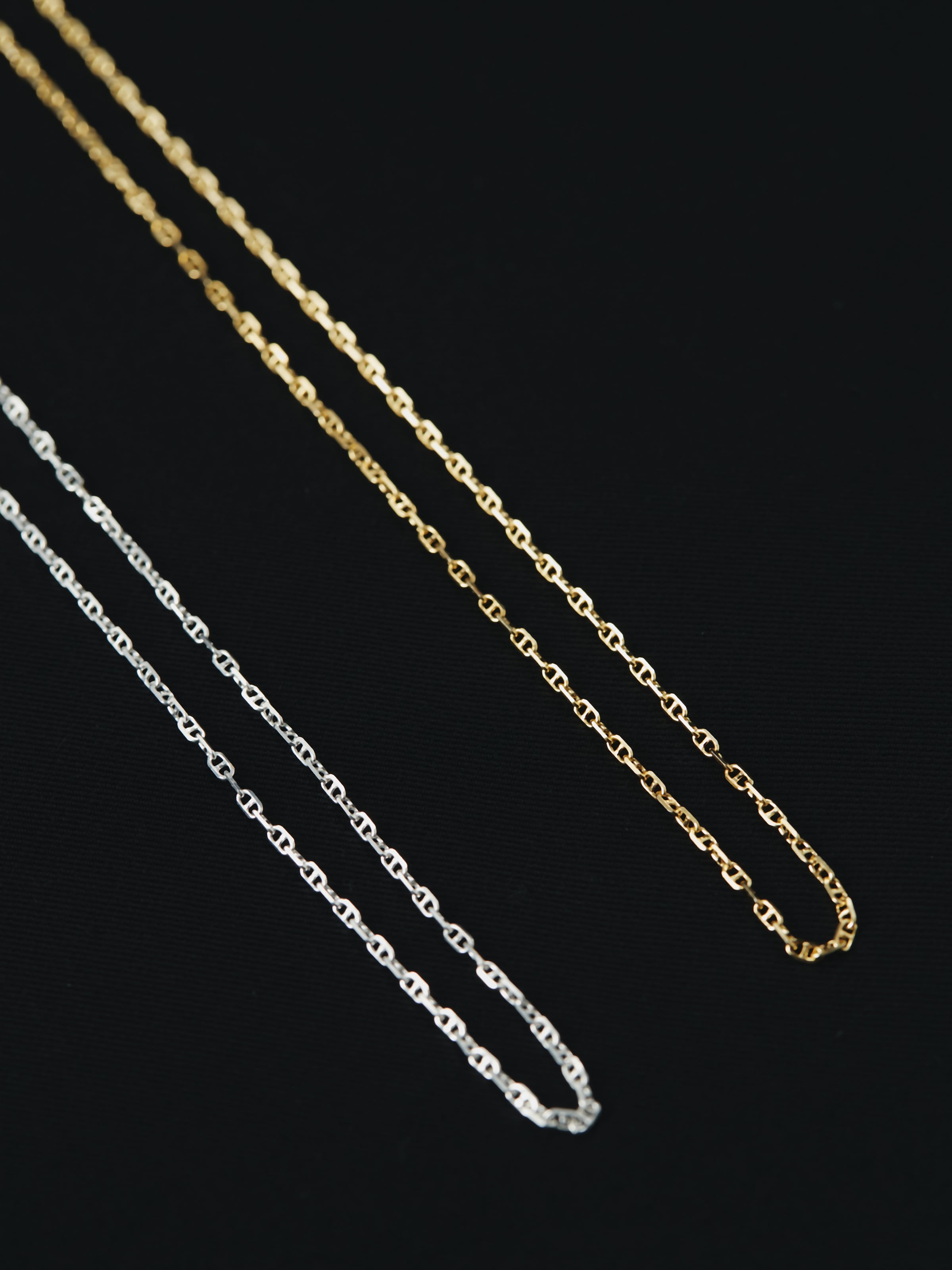 コーヒー豆のような丸みを帯びたオーバルリンクが連なる、ブタ鼻チェーン(Pig Nose/Coffee Beanチェーン)を採用。
