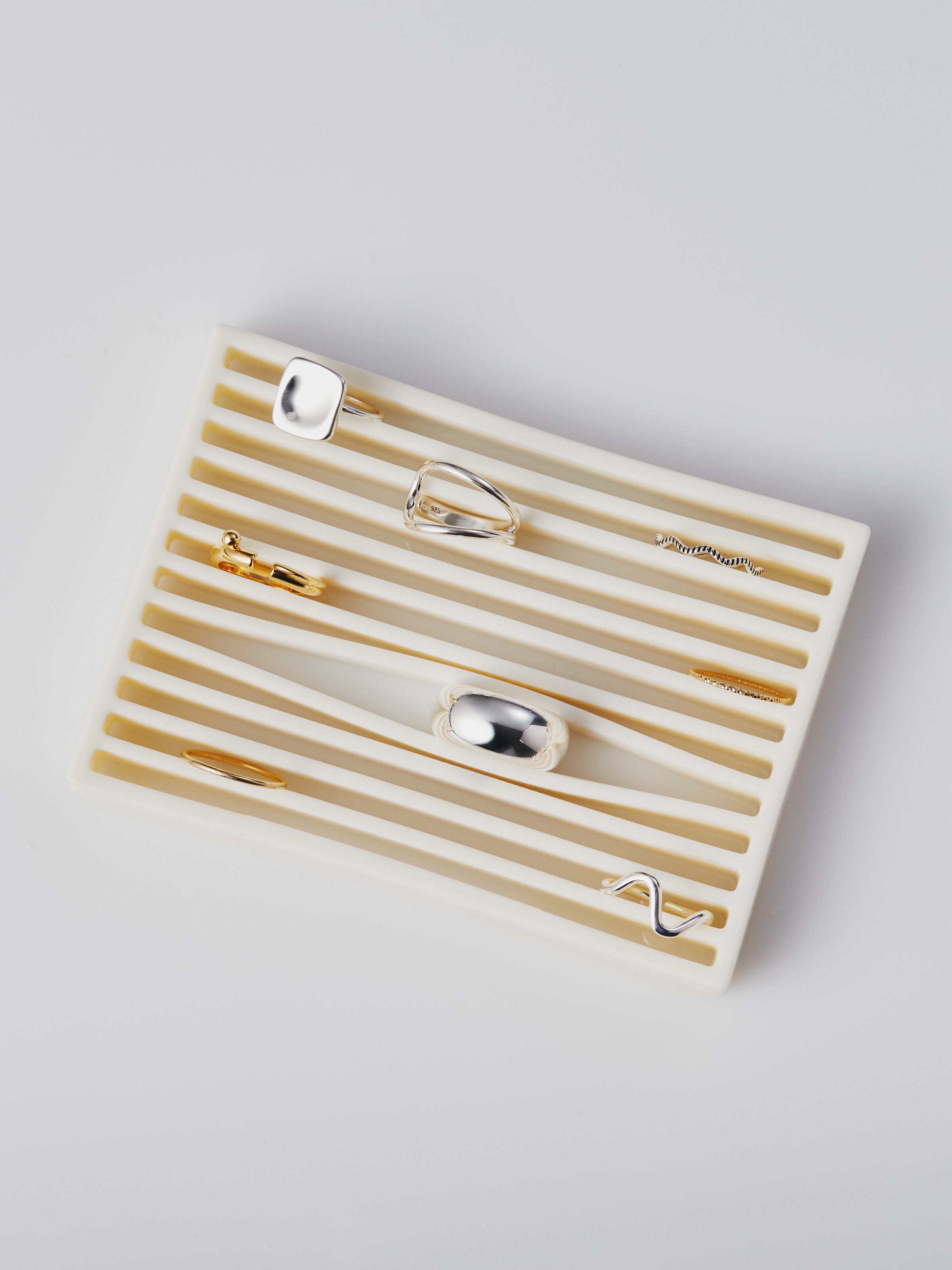 滑らかなシルバーの質感が美しく、シンプルなデザインながらしっかりとした存在感を放ちます。