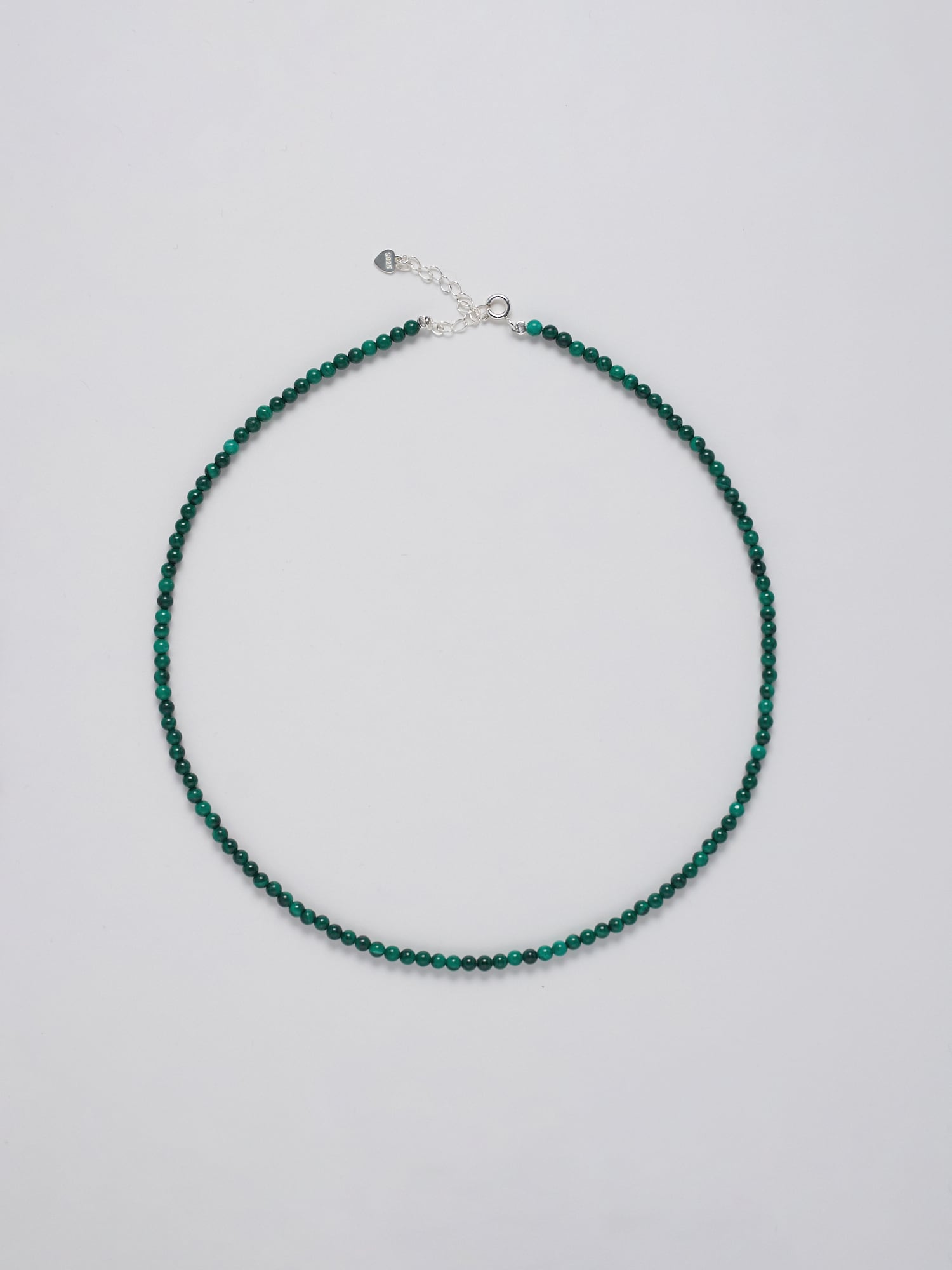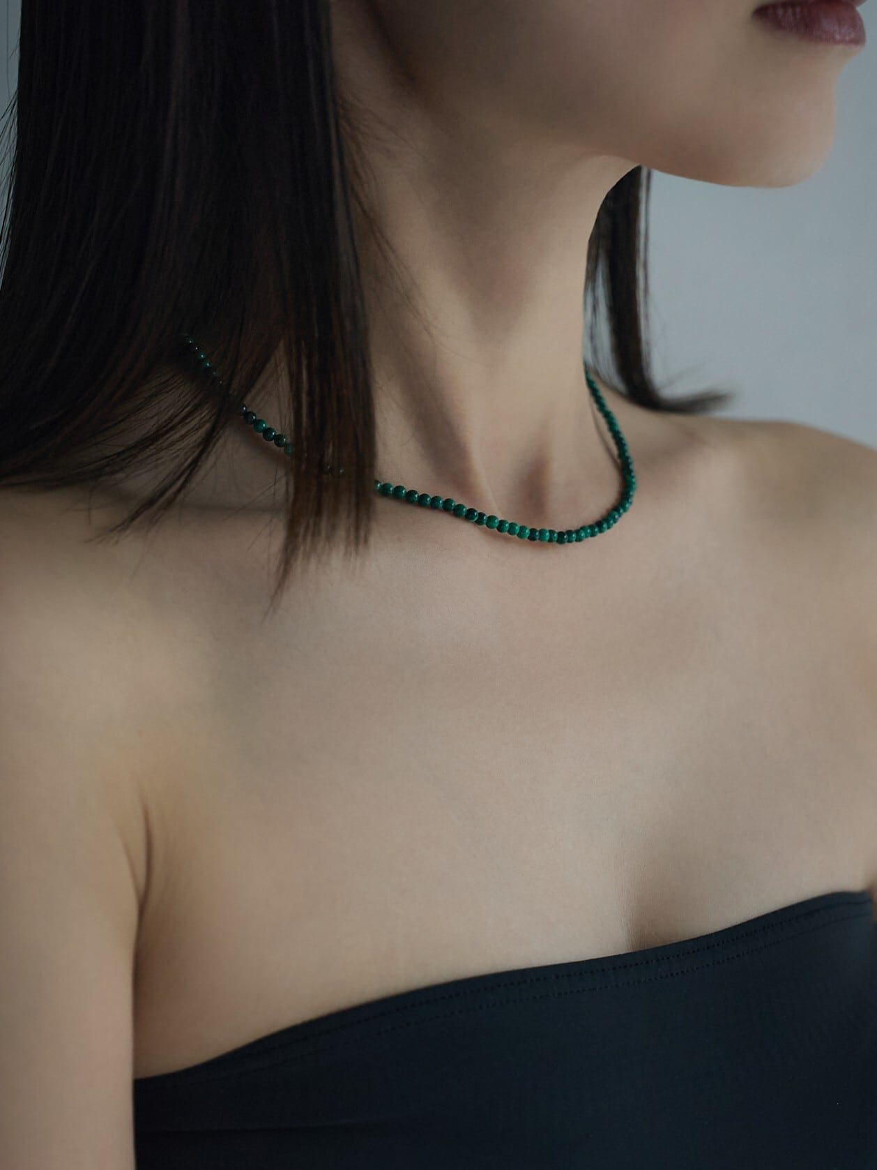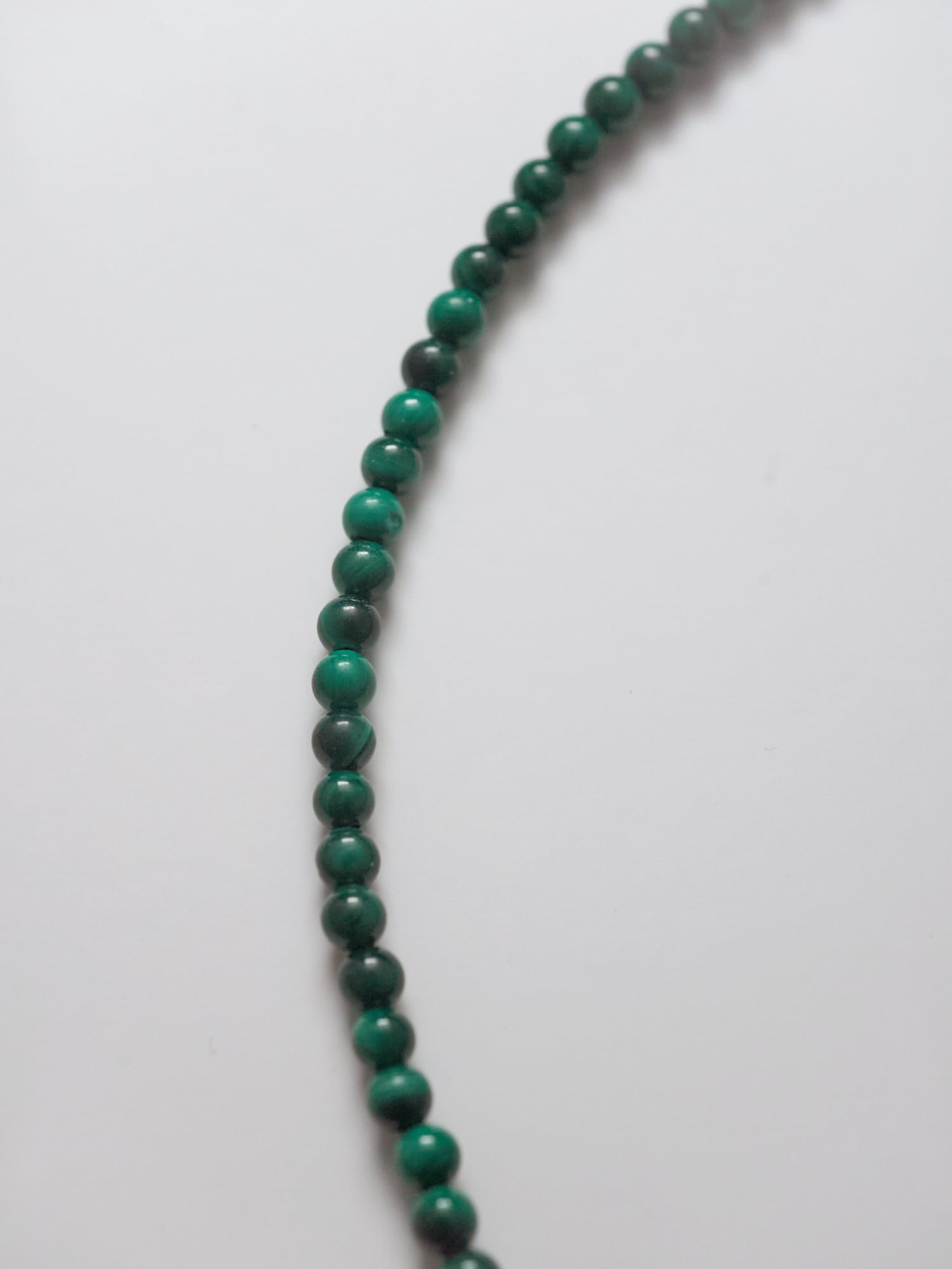 深みのあるグリーンの縞模様が美しいマラカイトストーンをシンプルにあしらったボールネックレス。