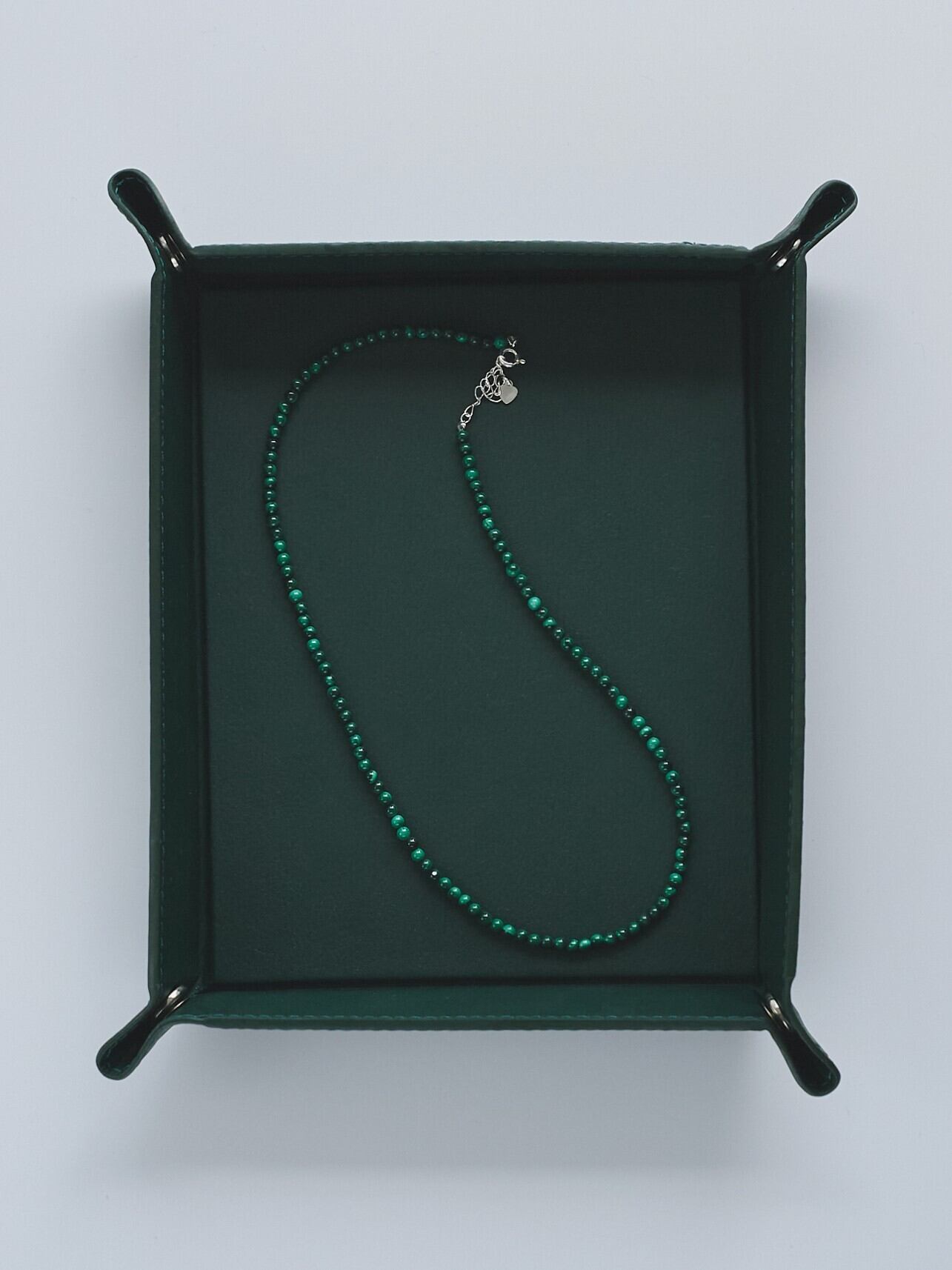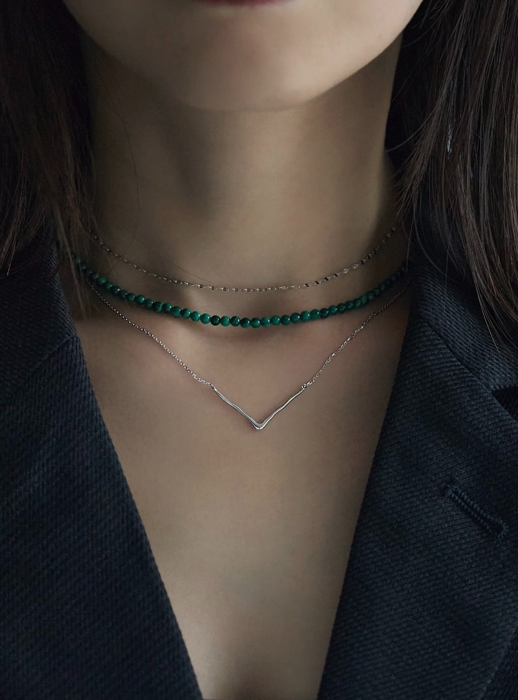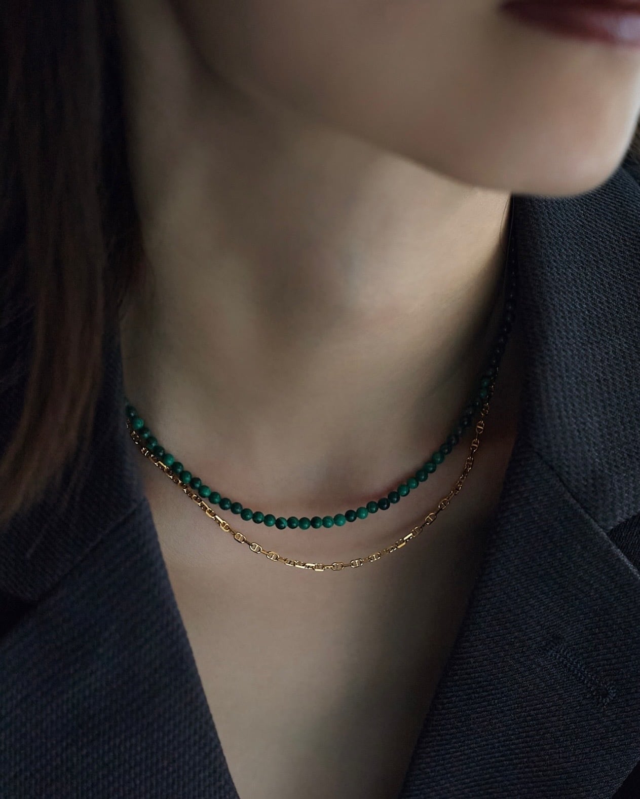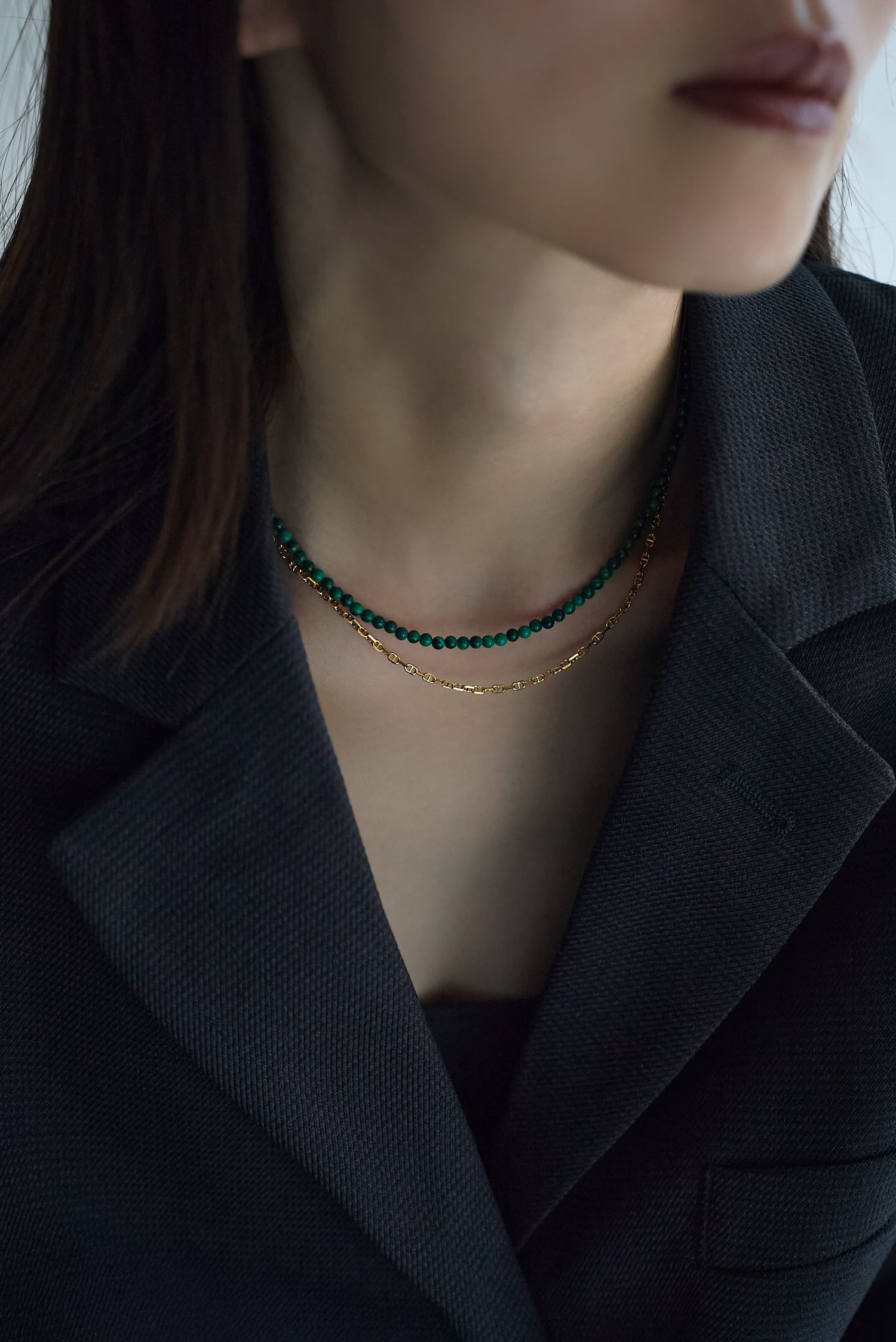 深みのあるグリーンの縞模様が美しいマラカイトストーンをシンプルにあしらったボールネックレス。
