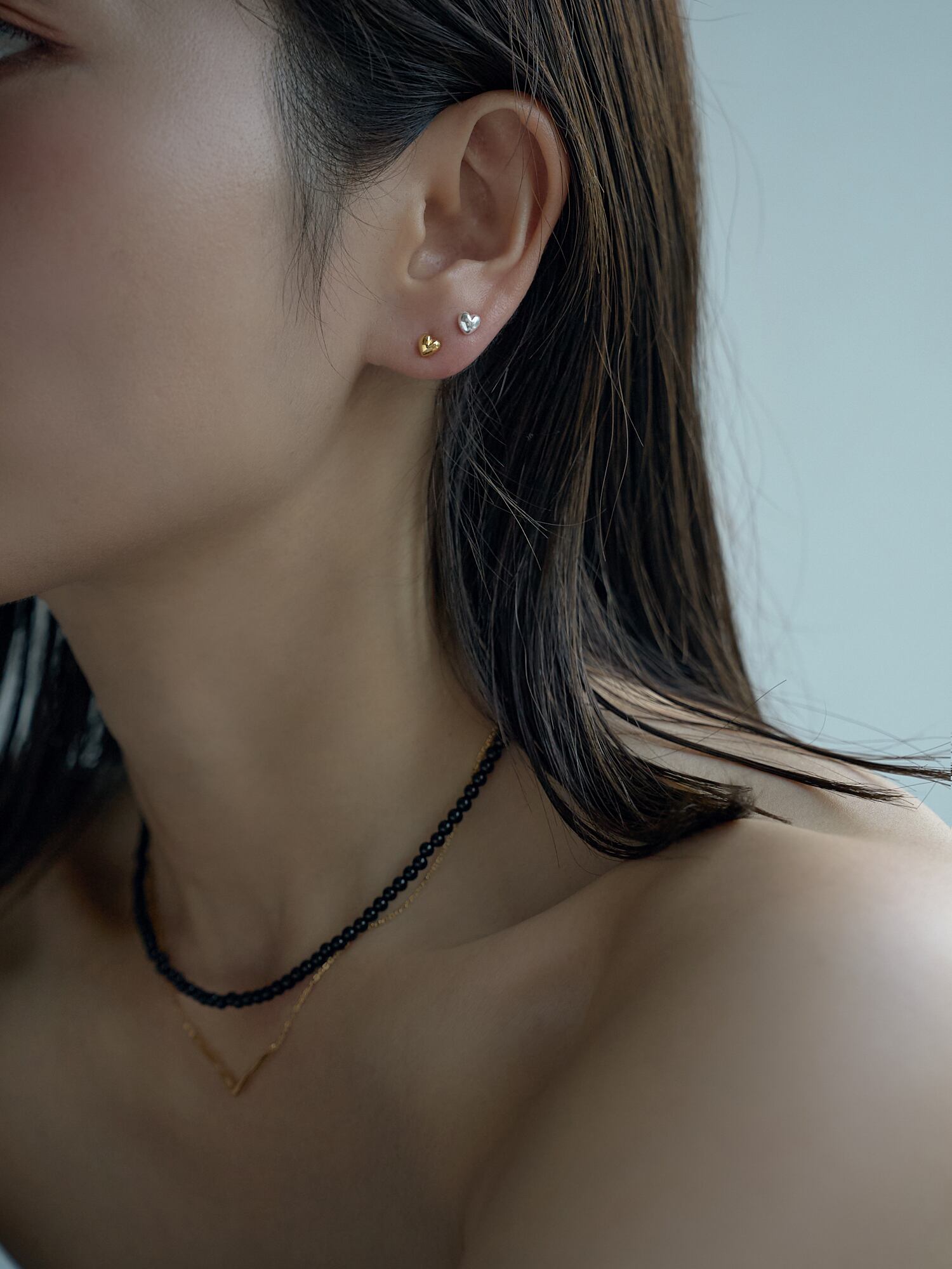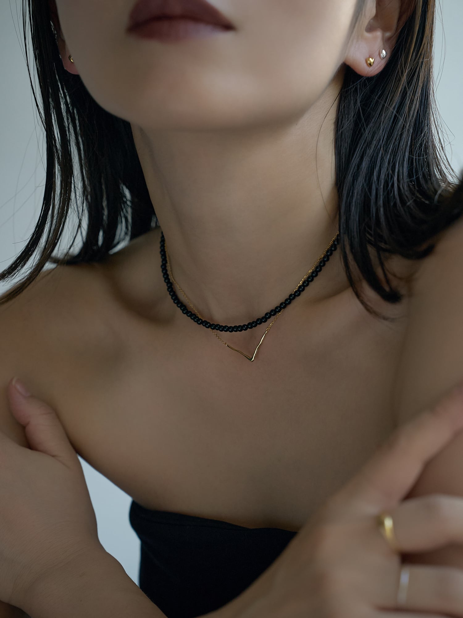 手持ちのネックレスとの重ね付けでもバランスよく馴染む万能アイテム。