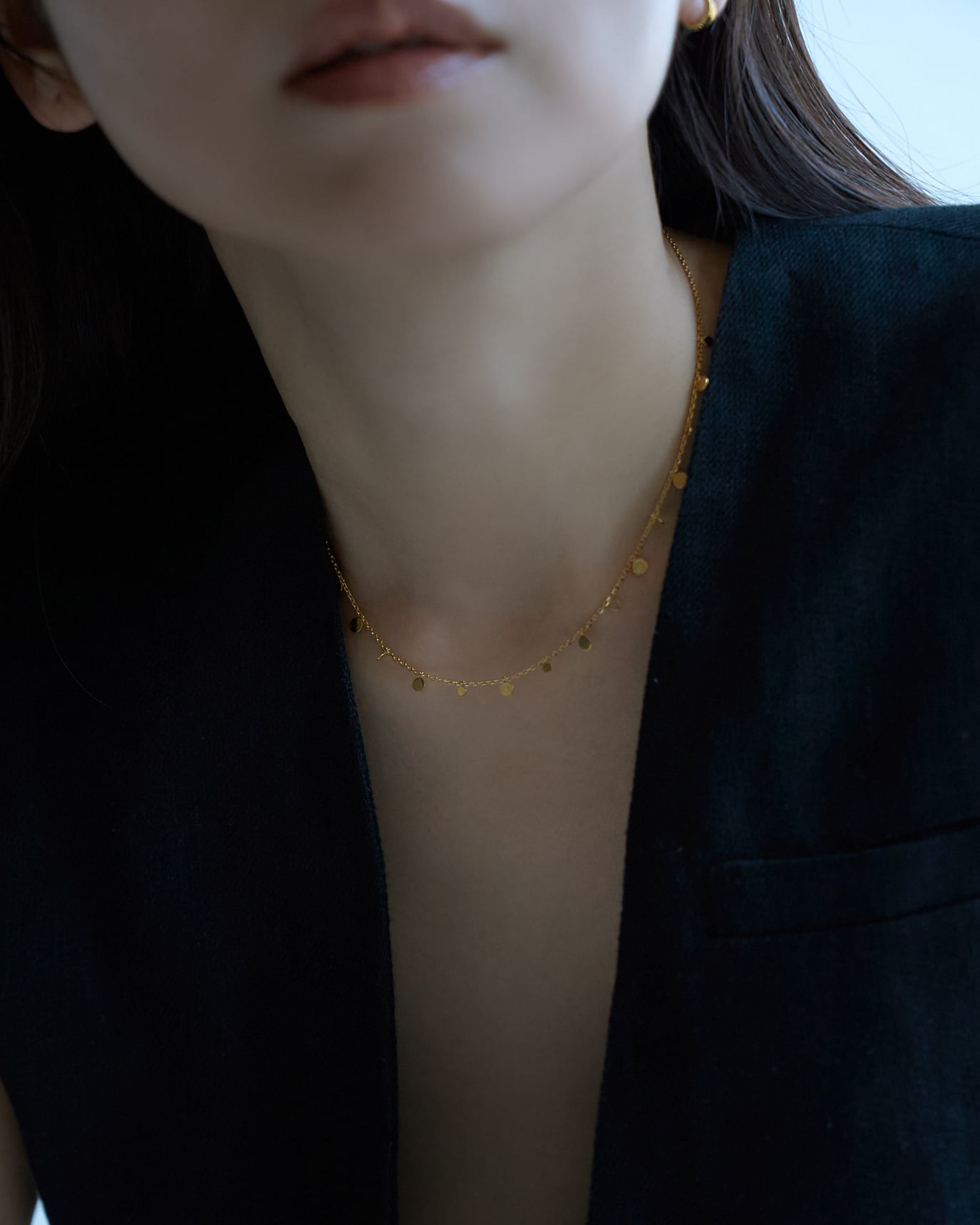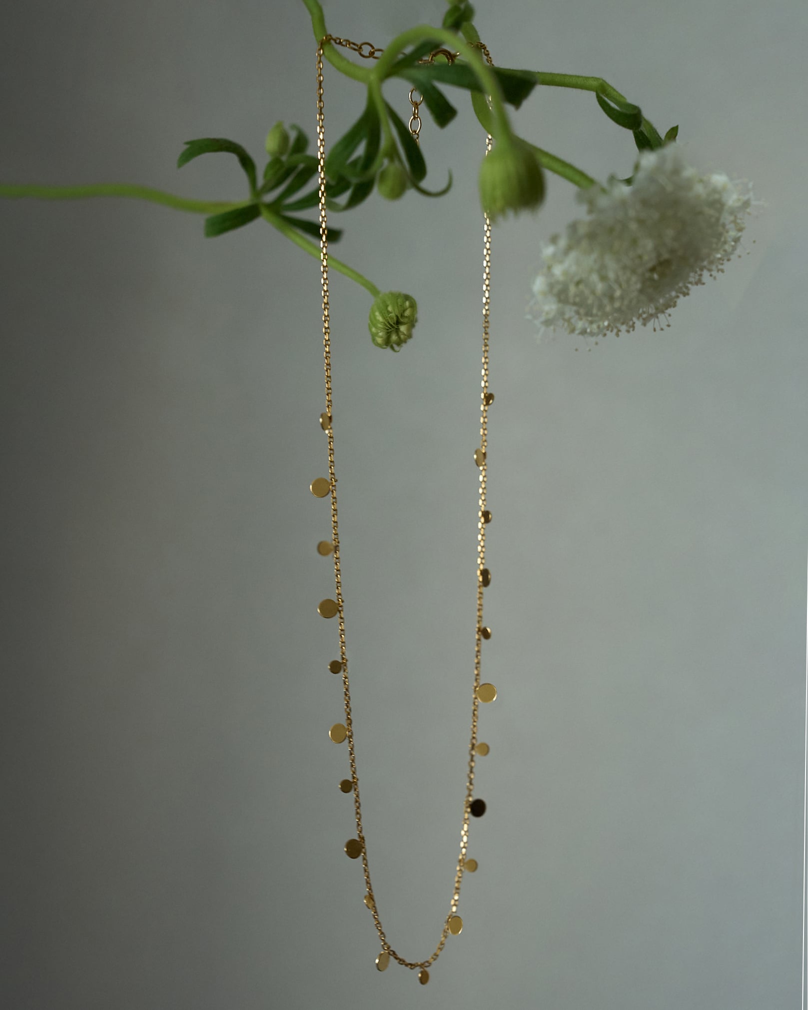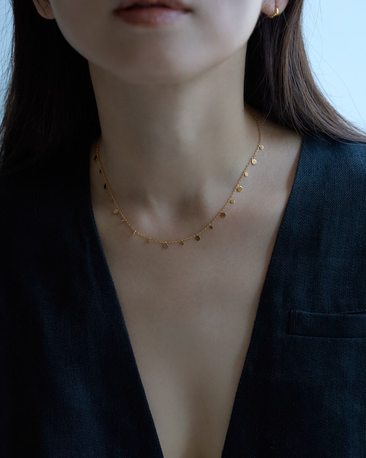 華奢なチェーンに、丸いプレートパーツが連なるデザインネックレス。