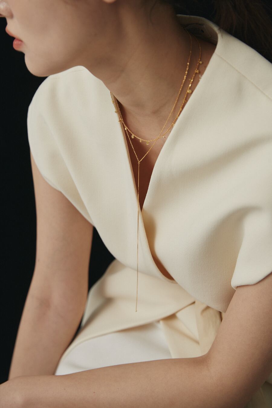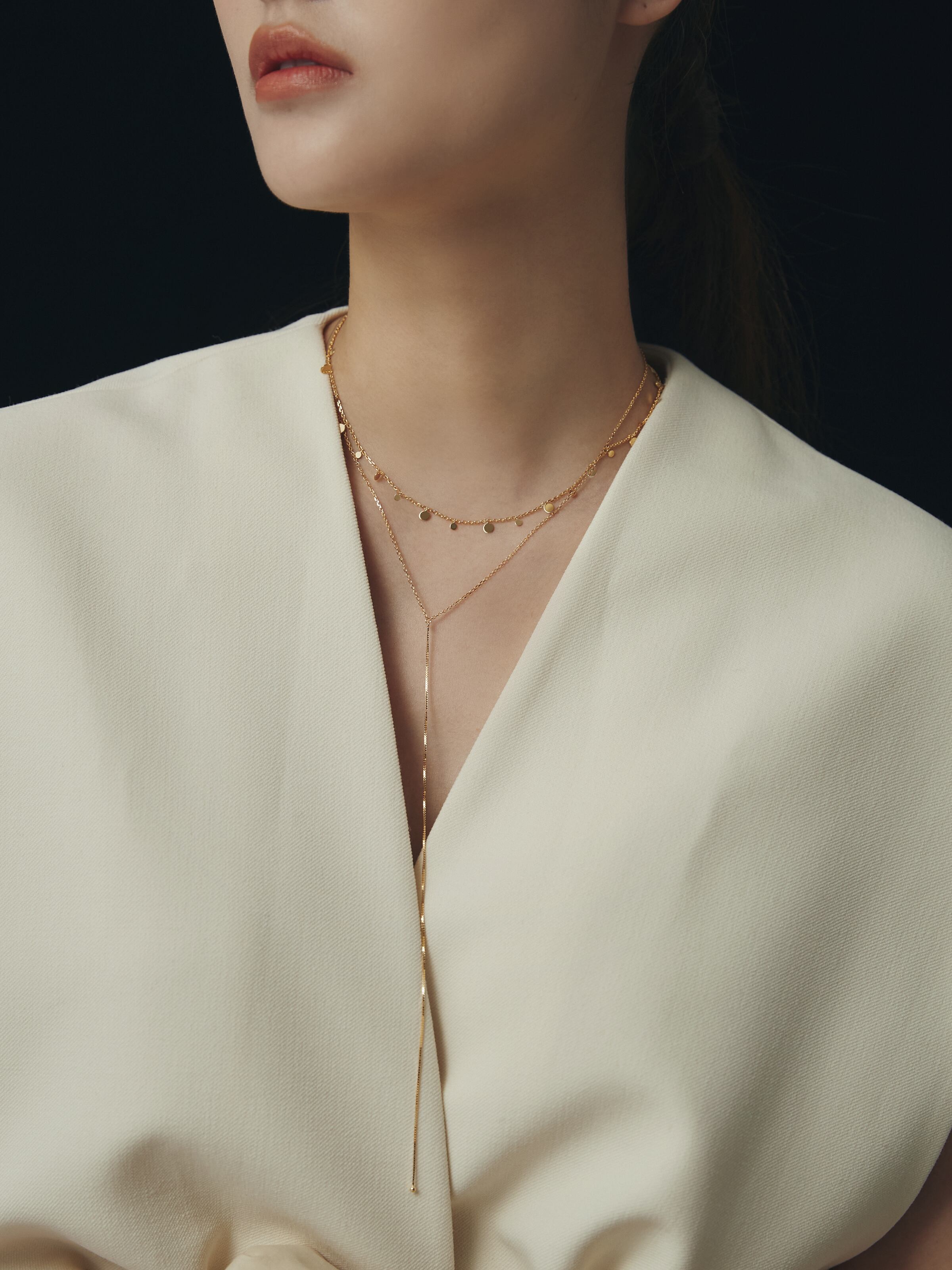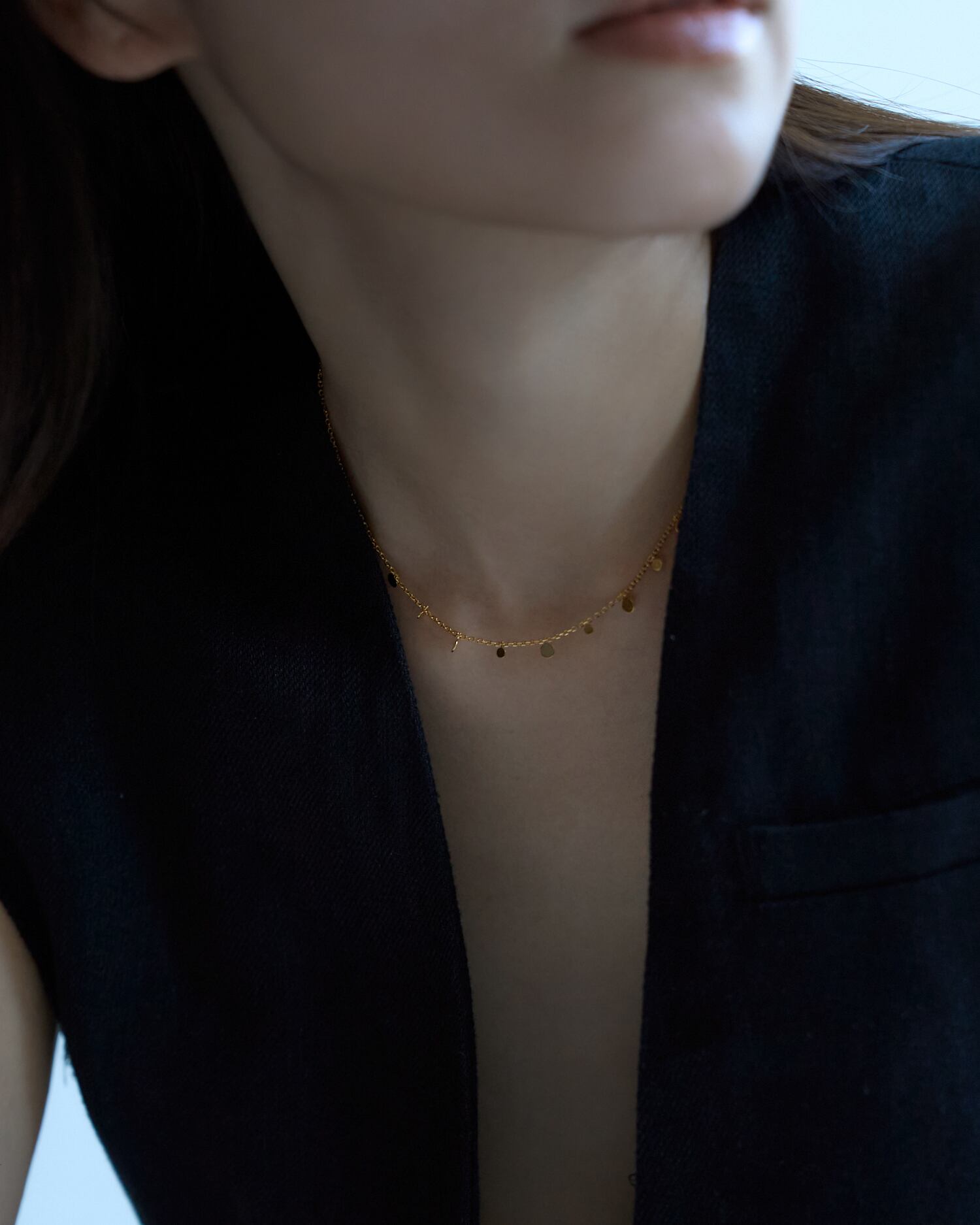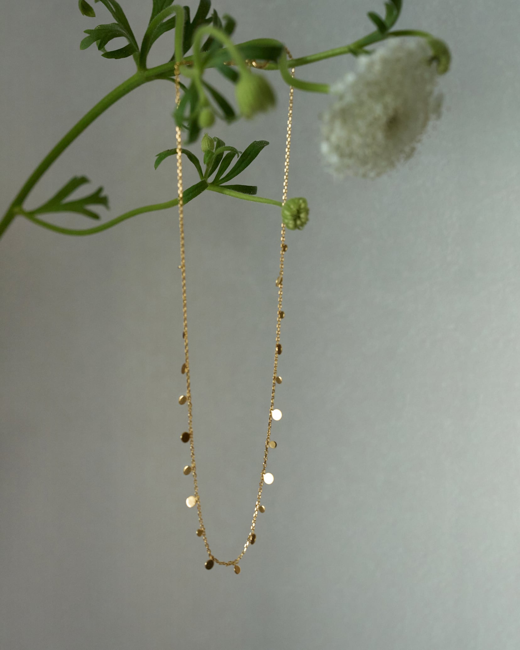 華奢なチェーンに、丸いプレートパーツが連なるデザインネックレス。