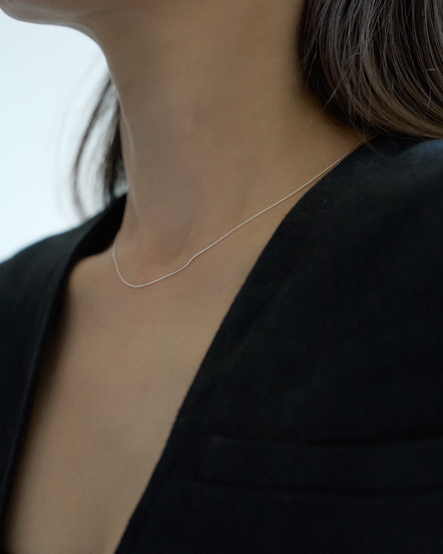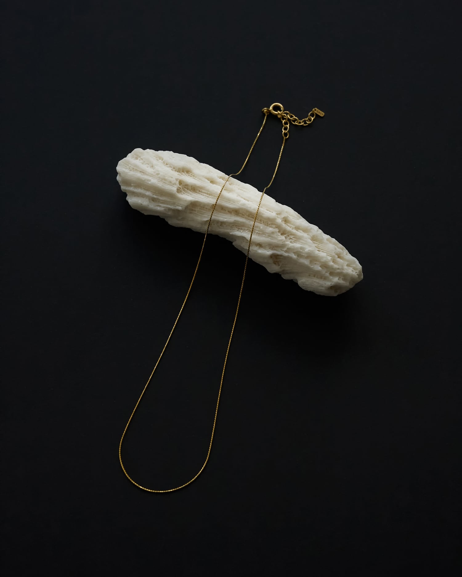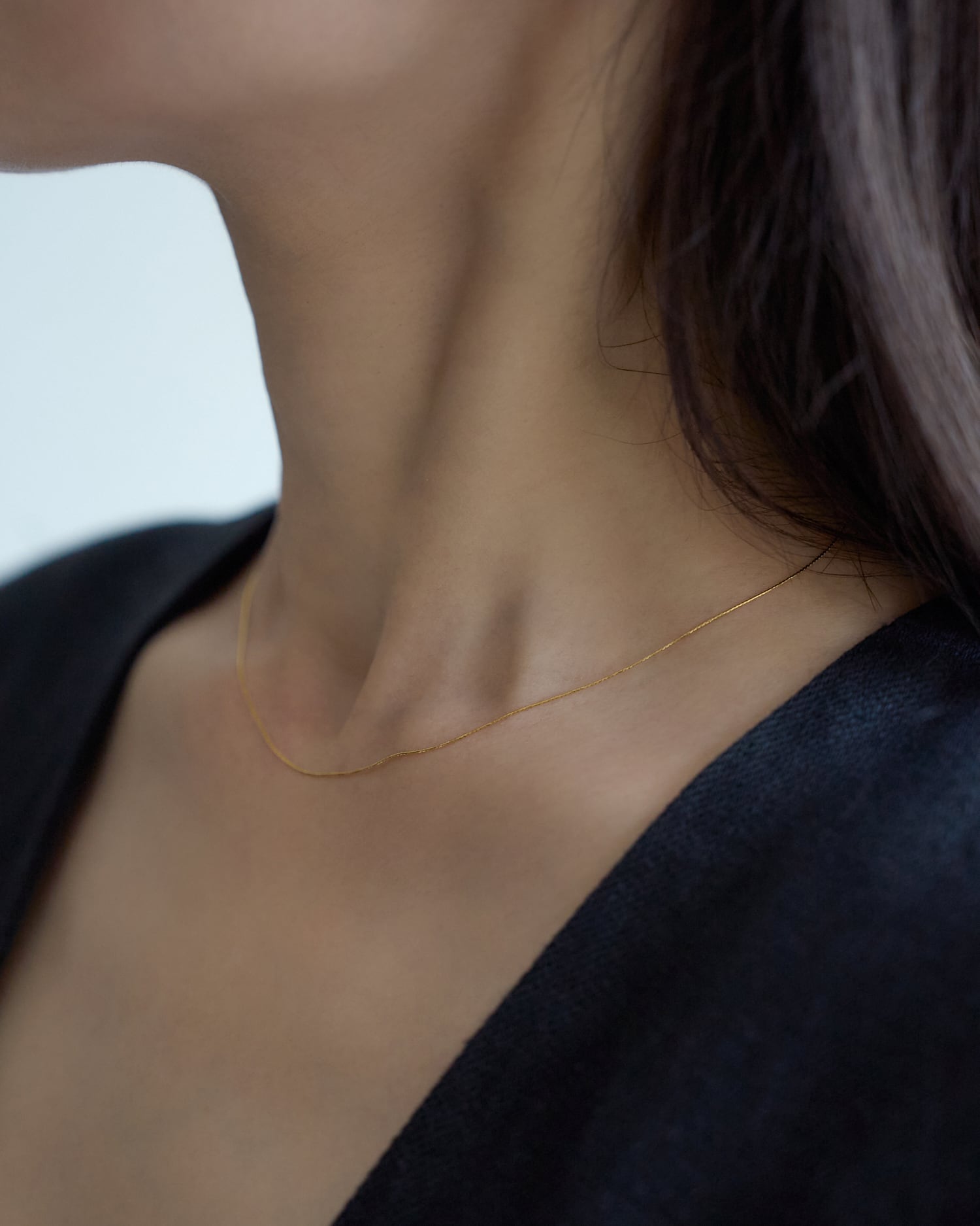 細身のスネークチェーンは、肌に優しくフィットし、スキンジュエリーとしても活躍。