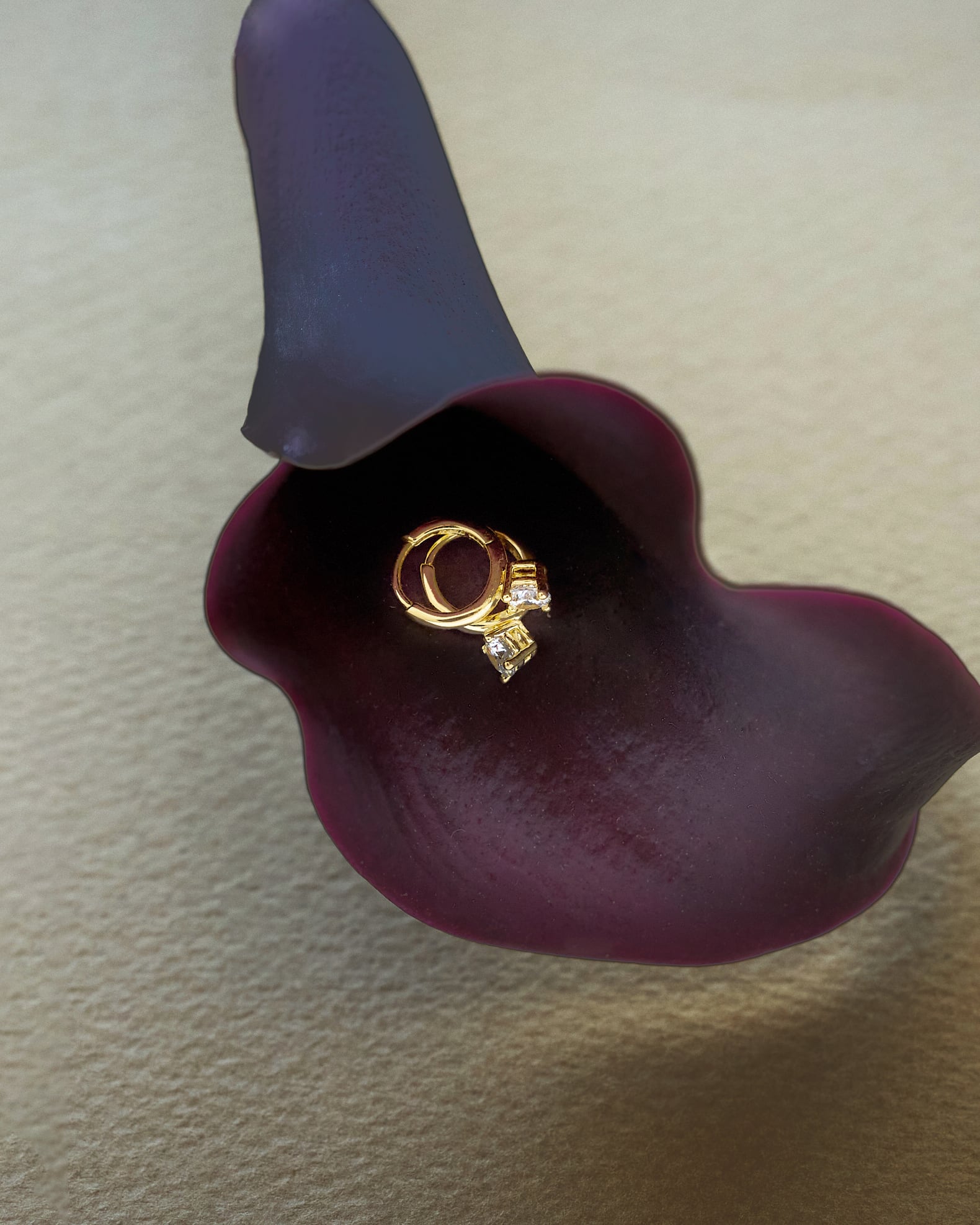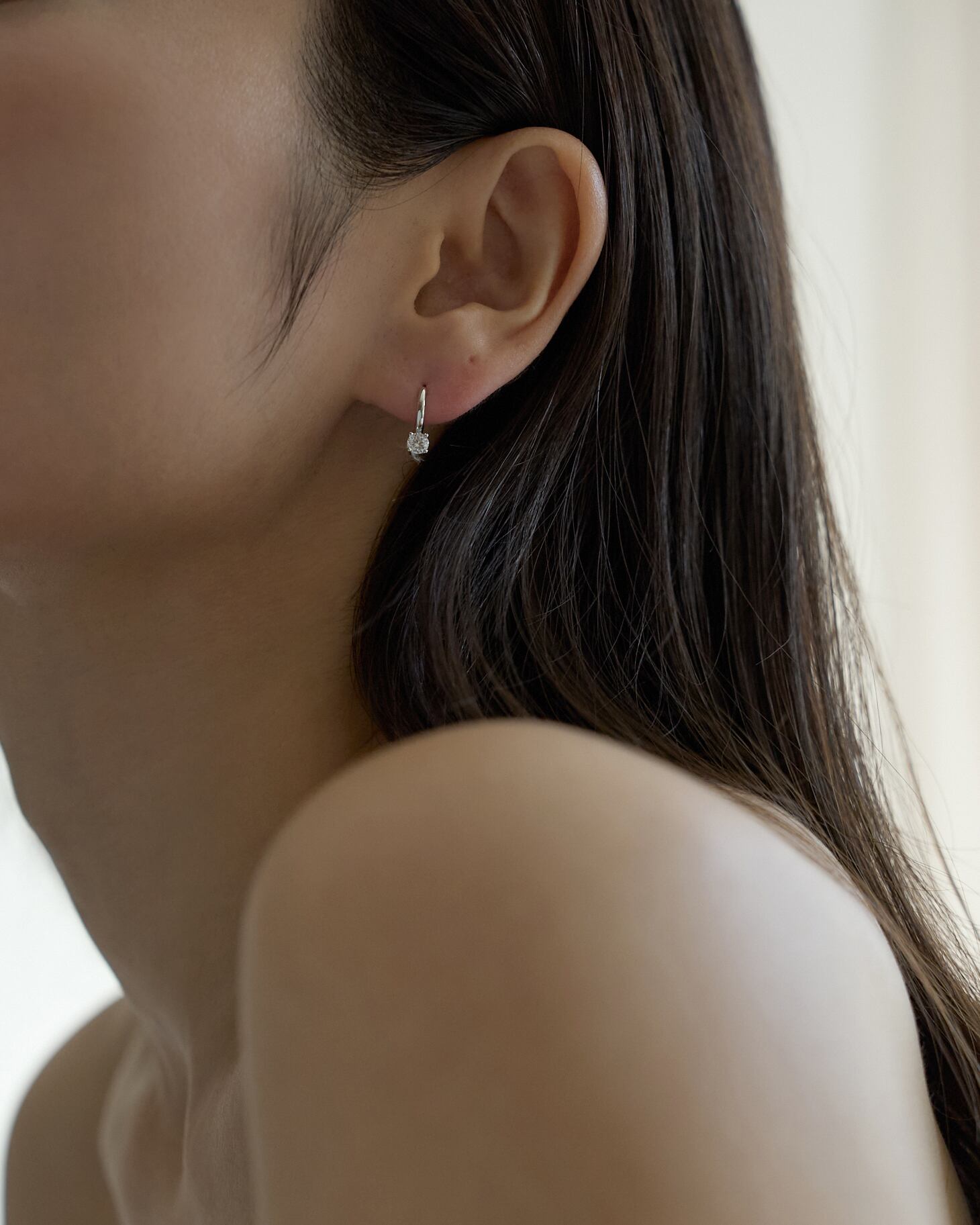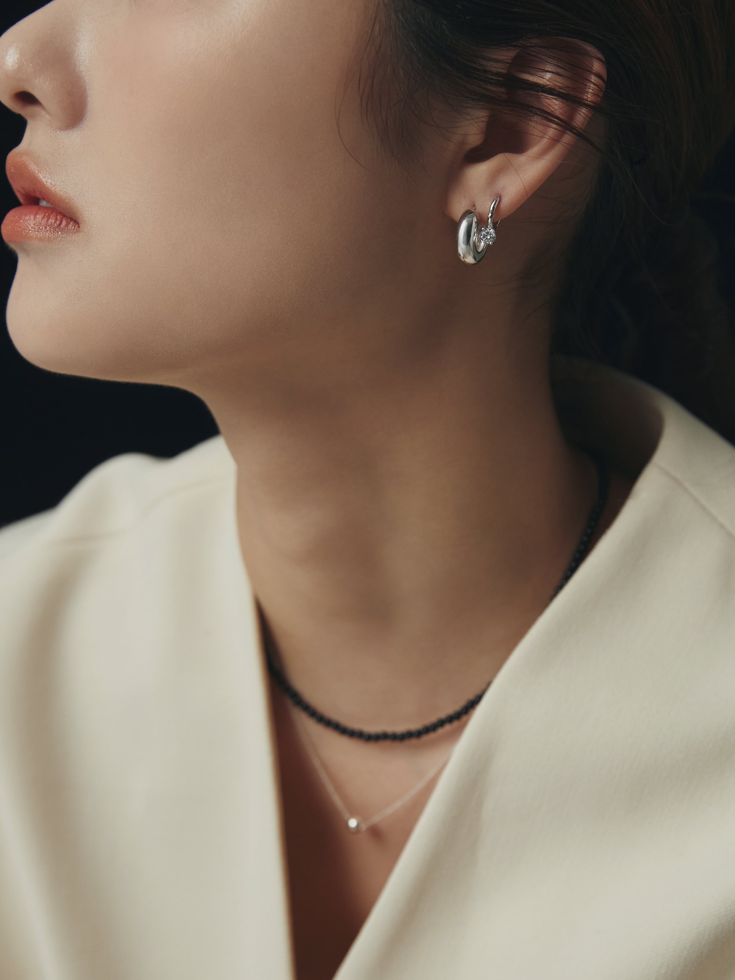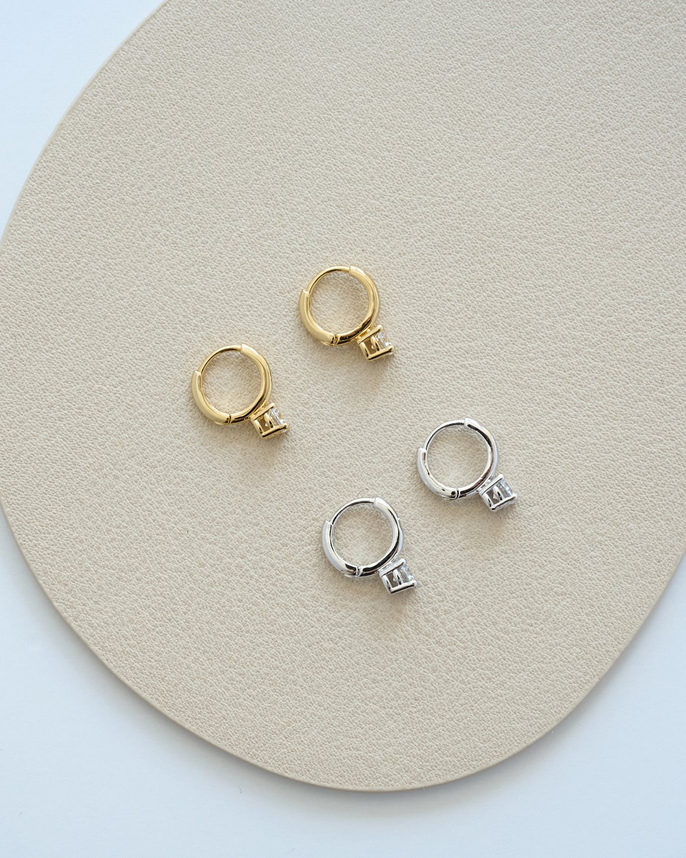 キュービックジルコニアを一粒あしらった、小ぶりなフープピアス。
