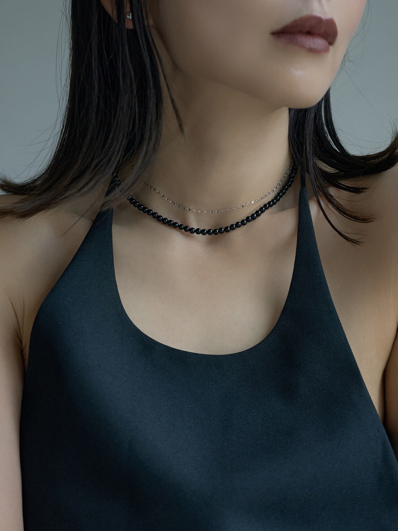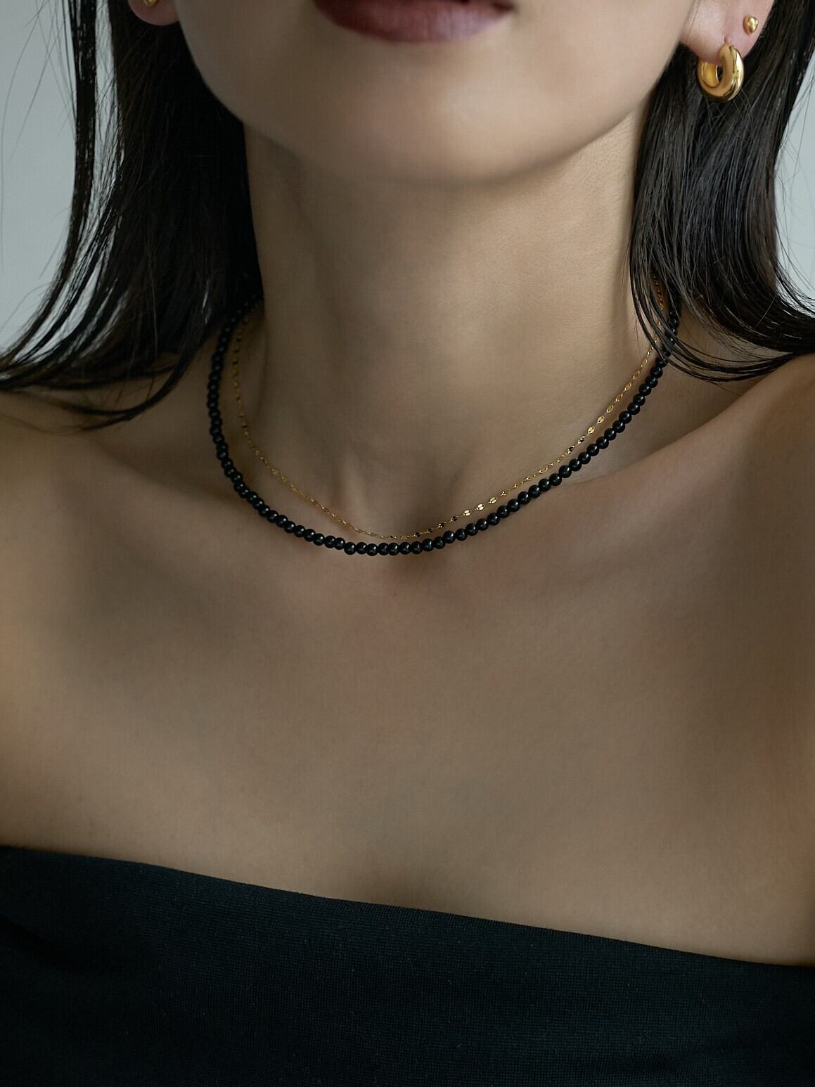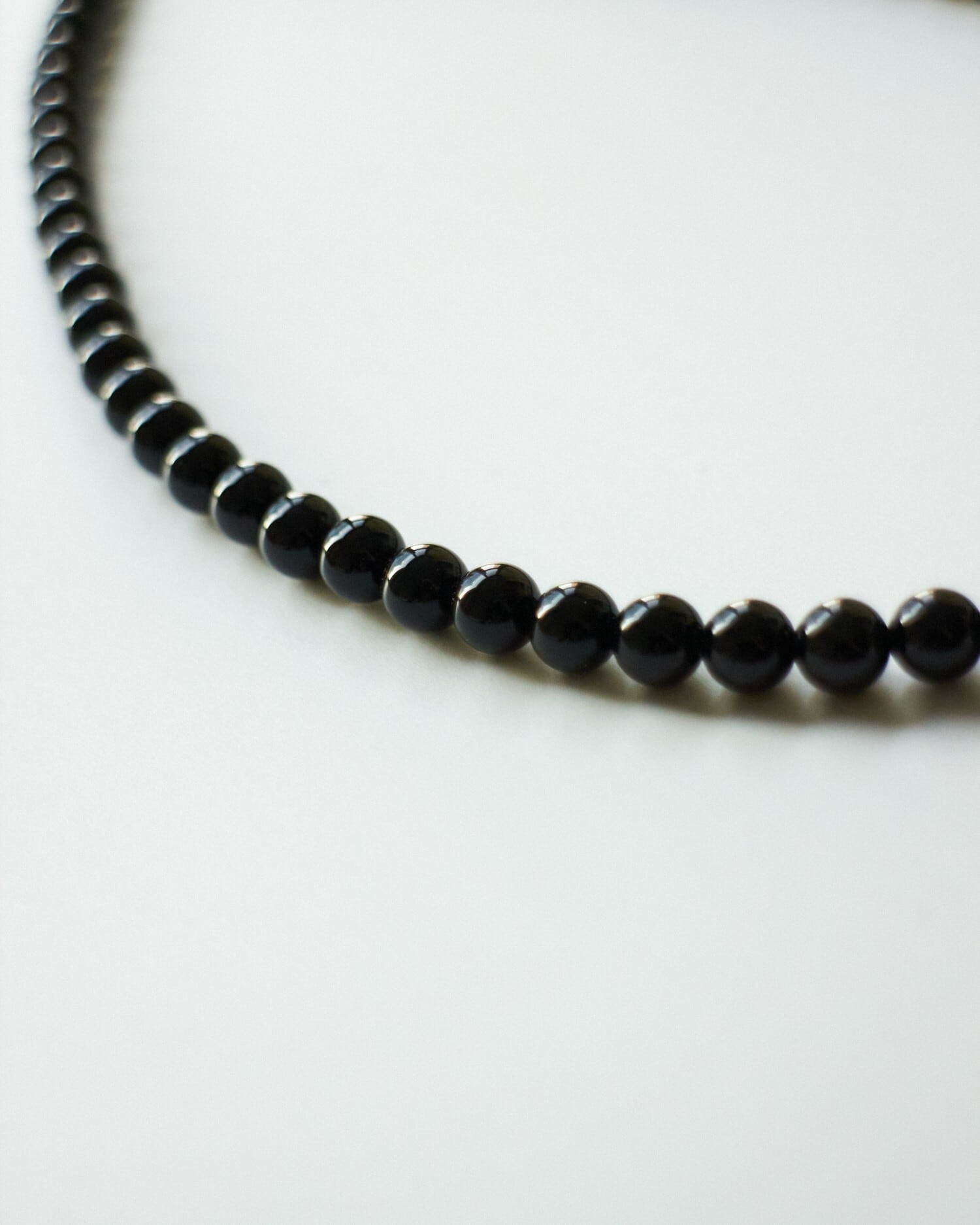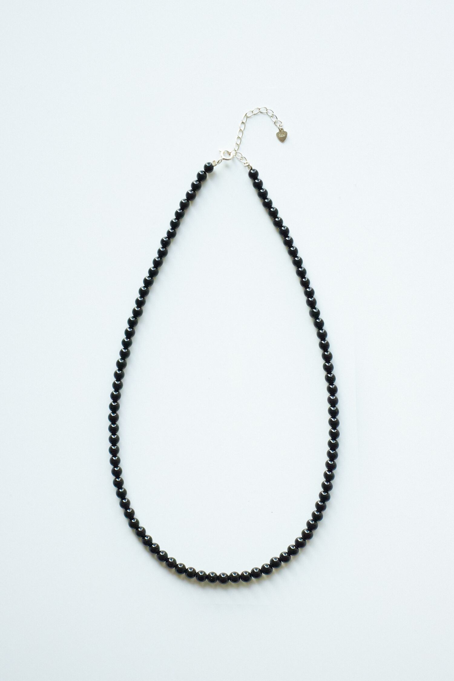 漆黒の輝きが魅力的なブラックオニキスをシンプルにあしらったボールネックレス。