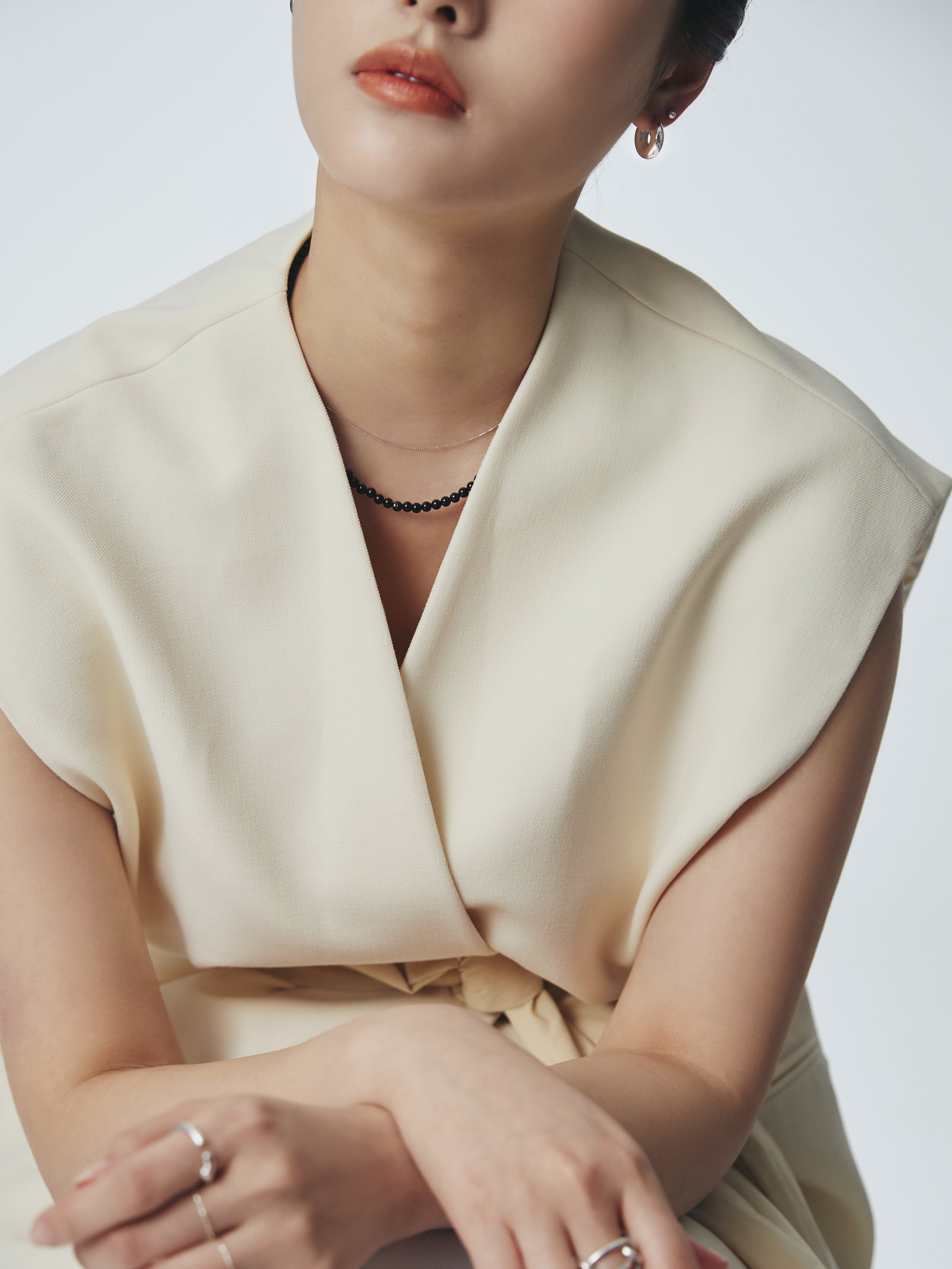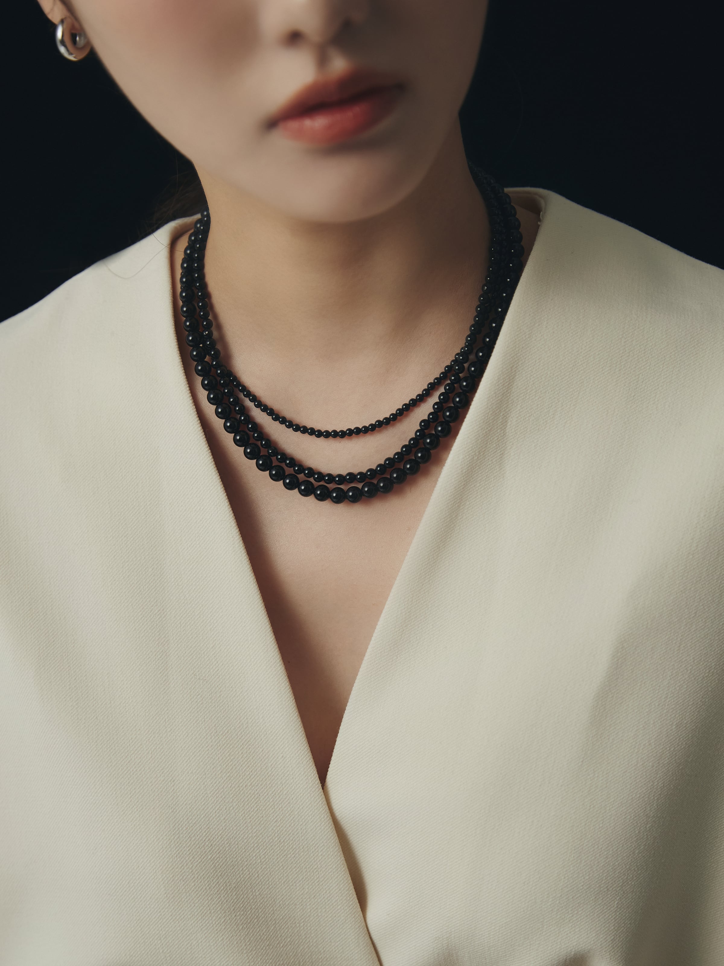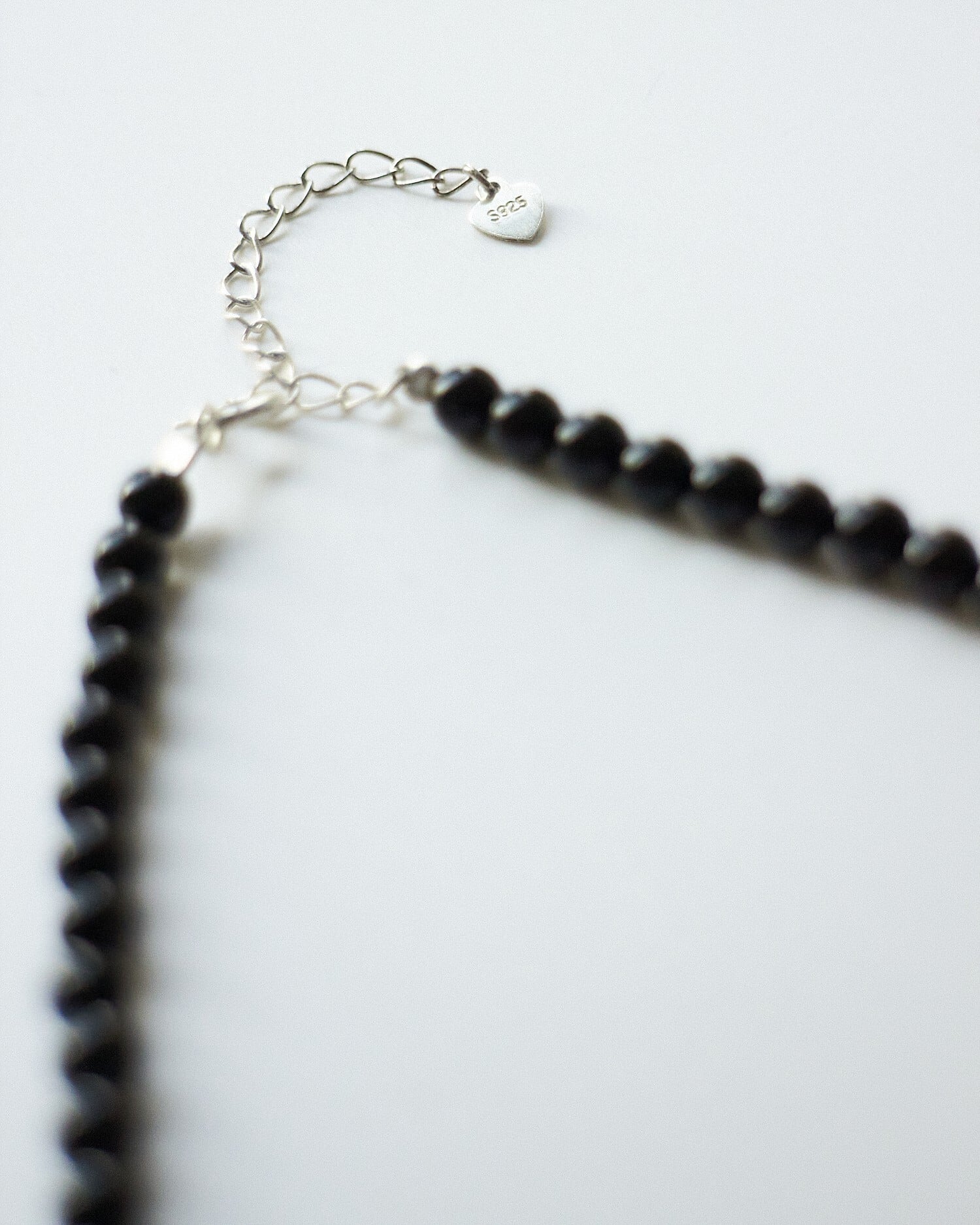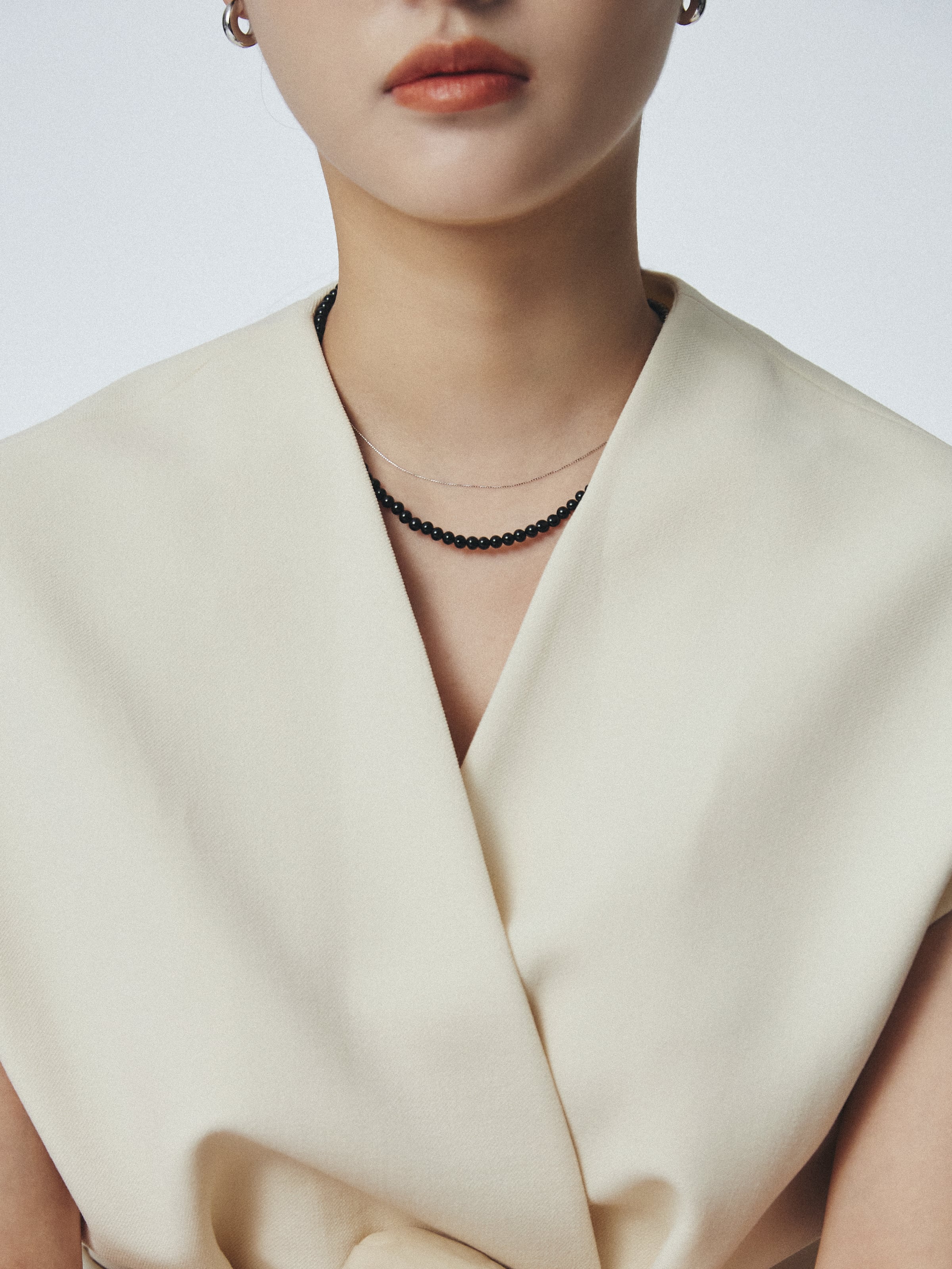 漆黒の輝きが魅力的なブラックオニキスをシンプルにあしらったボールネックレス。